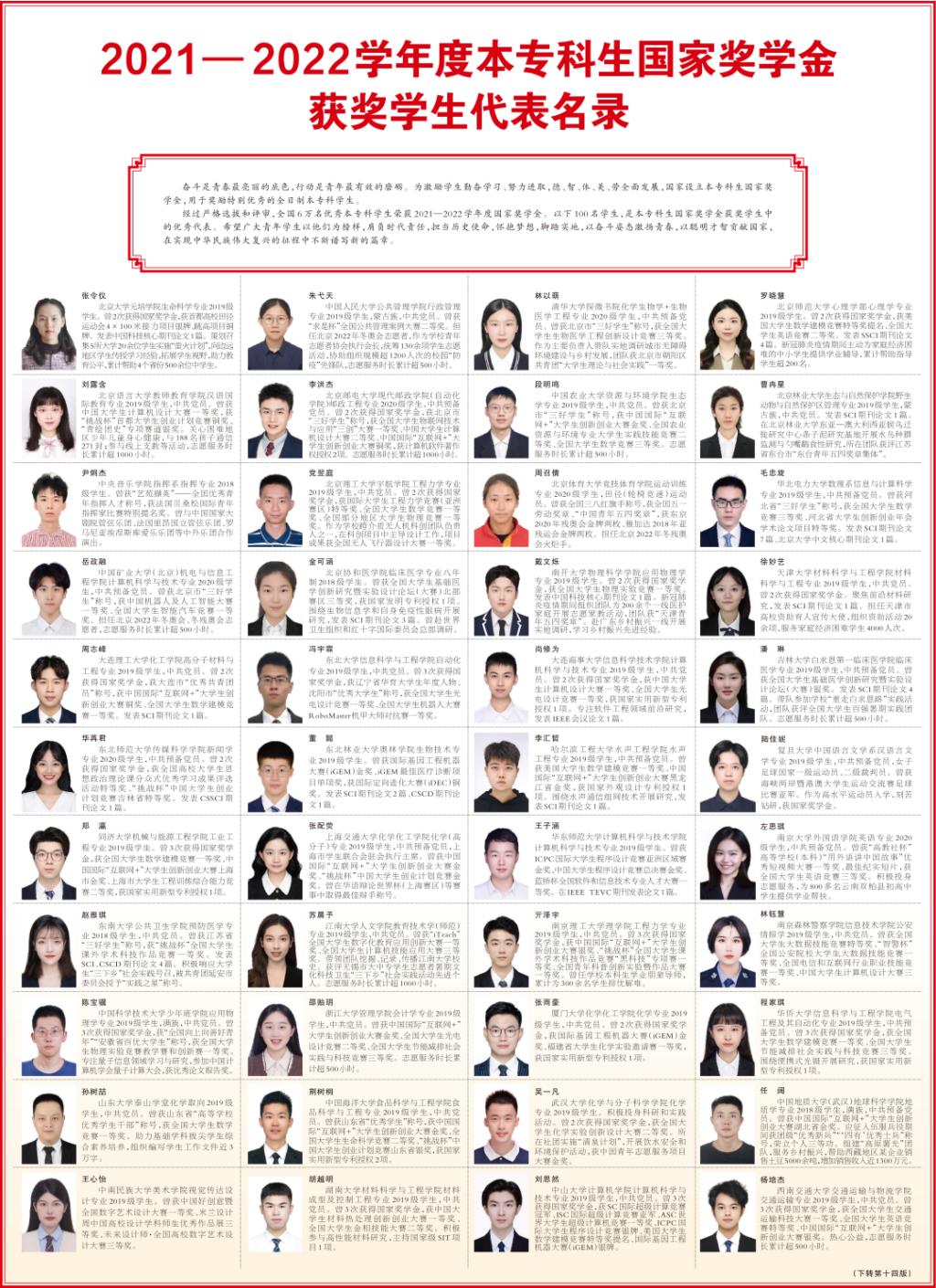 经过严格选拔和评审,全国6万名优秀本专科学生荣获2021—2022学年度国家奖学金。以下100名学生,是本专科生国家奖学金获奖学生中的优秀代表。希望广大青年学生以他们为榜样,肩负时代责任,担当历史使命,怀抱梦想,脚踏实地,以奋斗姿态激扬青春,以聪明才智贡献国家,在实现中华民族伟大复兴的征程中不断谱写新的篇章。