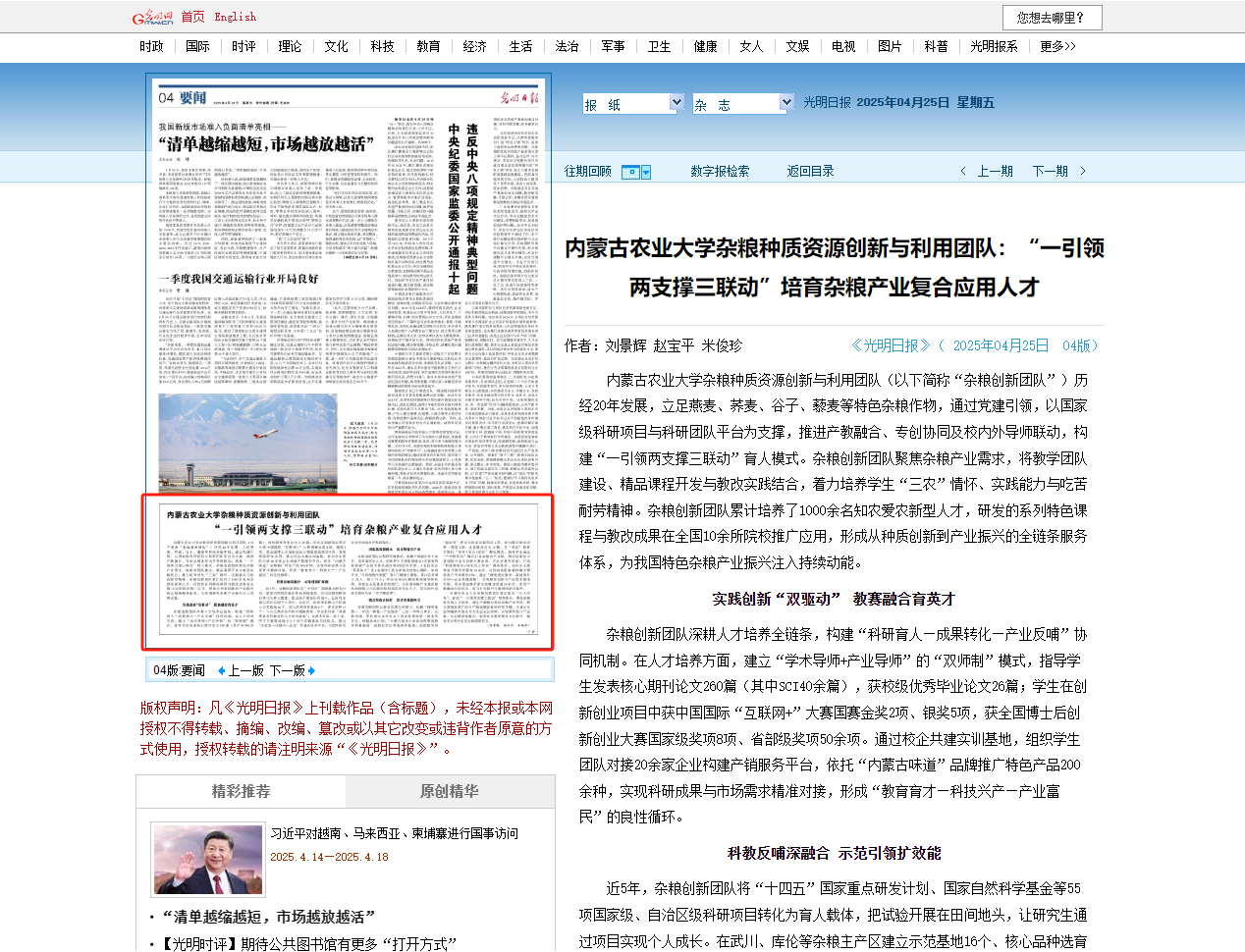 【编者按】2025年4月25日《光明日报》第四版报道了KY开元杂粮种质资源创新与利用团队在人才培养和产业服务方面的卓越成就,彰显了学校在服务乡村振兴、粮食安全和生态安全中的重要作用,进一步扩大了社会影响力。文章总结了团队通过“一引领两支撑三联动”育人模式,将党建引领、科研项目与平台支撑、产教融合相结合,培养了大批知农爱农的新型人才,研发的课程和教改成果在全国推广应用,形成了“教育育才—科技兴产—产业富民”的良性循环,为农业强国建设提供科技支撑和人才保障。