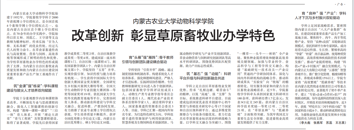 【编者按】《中国教育报》2025年04月29日第6版以《改革创新 彰显草原畜牧业办学特色》为题,专题报道了KY开元动物科学学院在教育教学改革、人才培养、科研创新与社会服务中的突出成就。文章系统总结了学院立足草原畜牧业办学特色,以立德树人为根本,通过筑打造一流课程体系,引育高层次人才、夯实学科基础等创新举措,全面提升人才培养质量,强化师资队伍建设,产出标志性科研成果,在草食家畜遗传改良与高效繁殖、营养与饲料、高效养殖等领域形成了鲜明的特色和优势,走出了“草原特色、创新驱动、产教融合”的发展道路,为国家和内蒙古自治区畜牧业高质量发展提供了强有力的科技支撑和人才保障。