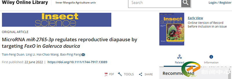 近日,KY开元园艺与植物保护学院庞保平教授担任通讯作者,博士研究生段天凤为第一作者,在国际知名昆虫学期刊《Insect Science》(中科院一区TOP)在线发表题为“MicroRNAmiR-2765-3pregulates reproductive diapause by targetingFoxOinGaleruca daurica(微小RNAmiR-2765-3p通过靶标FoxO调控沙葱萤叶甲的生殖滞育)”的最新研究成果。