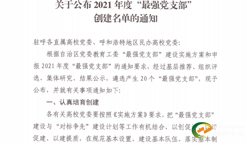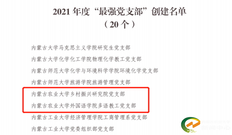 日前,自治区党委教育工委下发《关于公布2021年度“最强党支部”创建名单的通知》(内教工委函〔2022〕62号),学校乡村振兴研究院党支部、外国语言学院多语教工党支部获评2021年度自治区党委教育工委“最强党支部”。