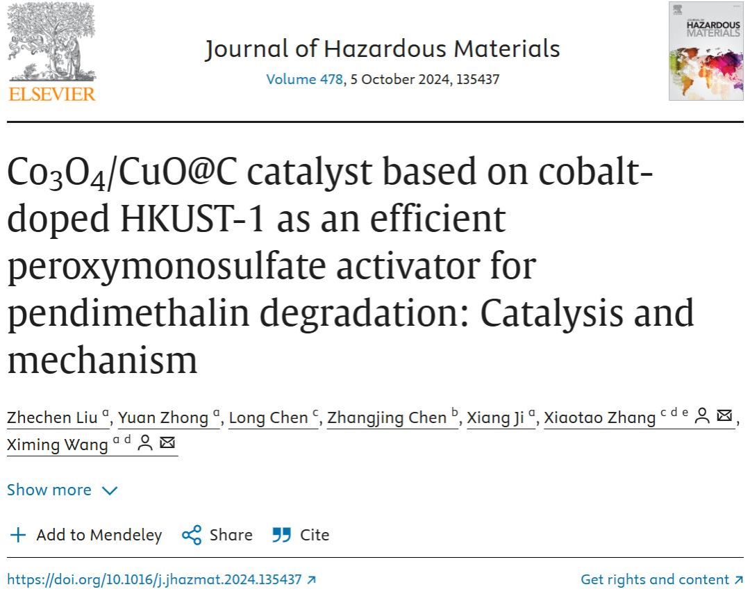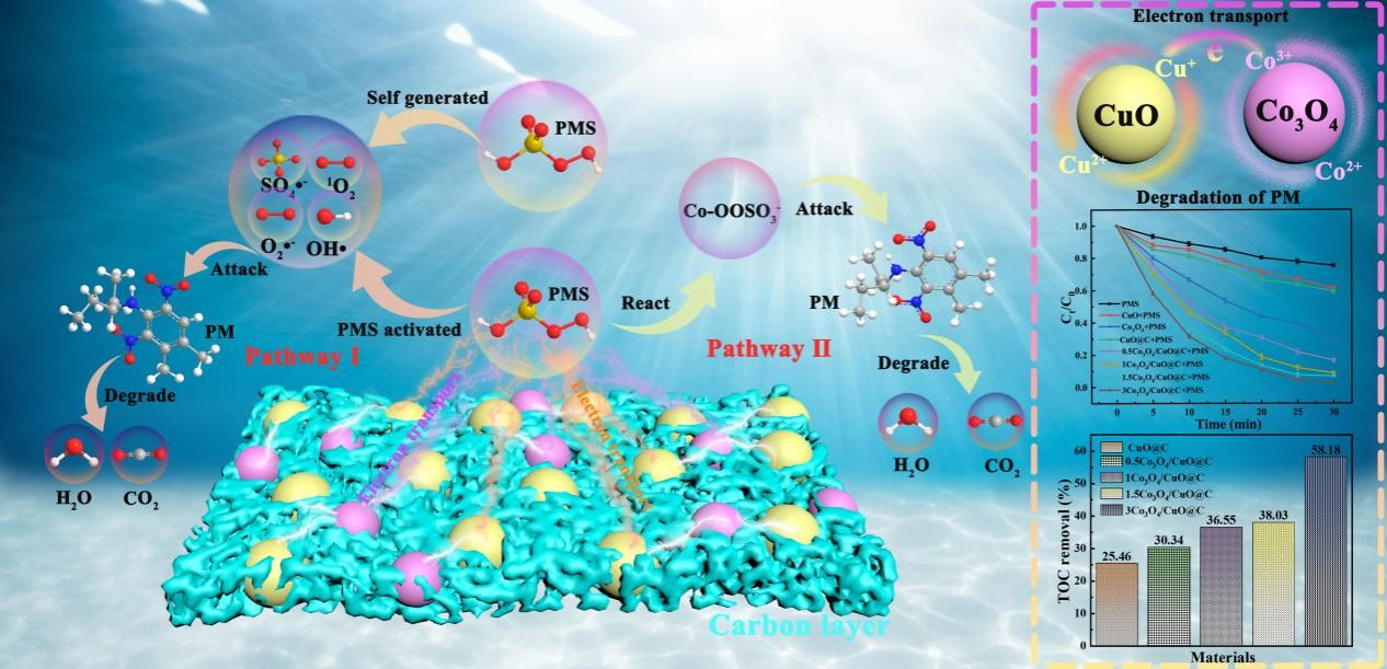 近日,KY开元师生的最新研究成果“基于钴掺杂HKUST-1的Co3O4/CuO@C催化剂高效活化PMS降解二甲戊灵:催化与机理”(Co3O4/CuO@C catalyst based on cobalt-doped HKUST-1 as an efficient peroxymonosulfate activator for pendimethalin degradation: Catalysis and mechanism)发表在《Journal of Hazardous Materials》上 (中国科学院一区TOP)。材料科学与艺术设计学院2022级博士研究生刘哲辰为第一作者,理学院张晓涛教授和材料科学与艺术设计学院王喜明教授为共同通讯作者,KY开元为唯一通讯单位。