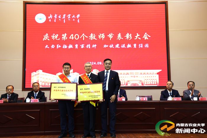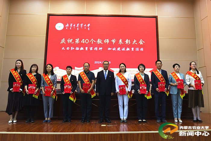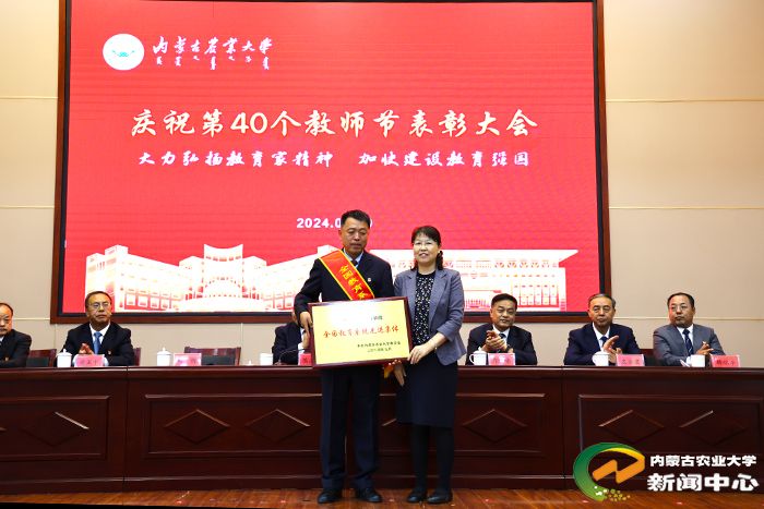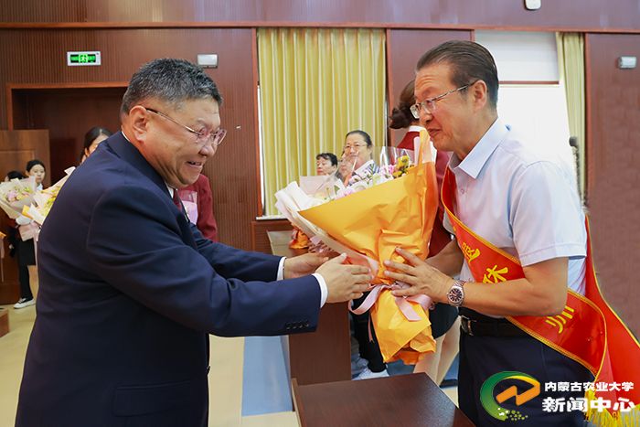 左合君宣读了表彰决定。校领导分别为受表彰团队和个人颁奖,为2024年荣休教师代表献花。其中,张和平团队获得“年度突出贡献奖”,食品科学与工程学院获得“2024 年全国教育系统先进集体”,草业学院、经济管理学院获得“2024年师德师风建设先进集体”。胡晓燕等10名教师获得“2024年师德师风标兵”,赵艳红等10名教师获得“2024年优秀教师”,伊六喜等10名教师获得“2024年优秀青年教师”,王丽等10名教师获得“2024年先进工作者”。