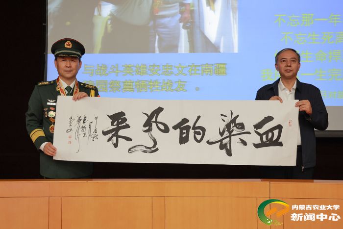 胡国桥向学校赠送了著名书法家文永安老师的书画作品“血染的风采”。