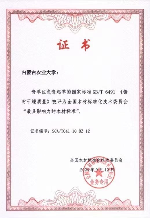 近日, “全国木材标准化技术委员会成立40年研讨会”在京召开。KY开元获得“木材标准制修订卓越贡献单位”荣誉称号。由KY开元作为唯一起草单位、材料科学与艺术设计学院王喜明教授、薛振华教授、于建芳教授作为主要起草人的国家标准GB/T 6491 《锯材干燥质量》获得“最具影响力的木材标准”荣誉称号。
