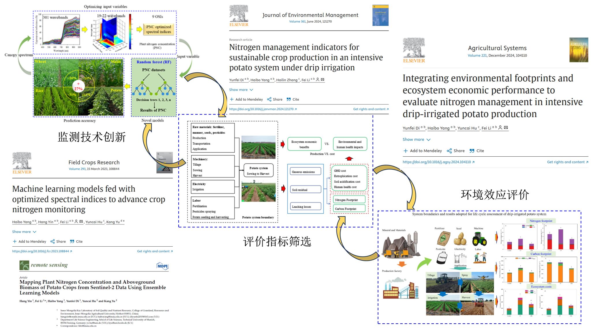 文章在线发表题目为“Machine learning models fed with optimized spectral indices to advance crop nitrogen monitoring”(基于优化光谱指数的机器学习模型提高作物氮素监测)、“Nitrogen management indicators for sustainable crop production in an intensive potato system under drip irrigation”(滴灌集约化马铃薯系统氮素管理指标评估为作物可持续生产提供助力)、“Integrating environmental footprints and ecosystem economic performance to evaluate nitrogen management in intensive drip-irrigated potato production”(结合环境足迹与生态系统经济绩效评估集约化滴灌马铃薯氮素管理)和“Mapping plant nitrogen concentration and aboveground biomass of potato crops from Sentinel-2 data using ensemble learning models”(利用集成学习模型从哨兵2数据绘制马铃薯作物氮素浓度和地上生物量)。
