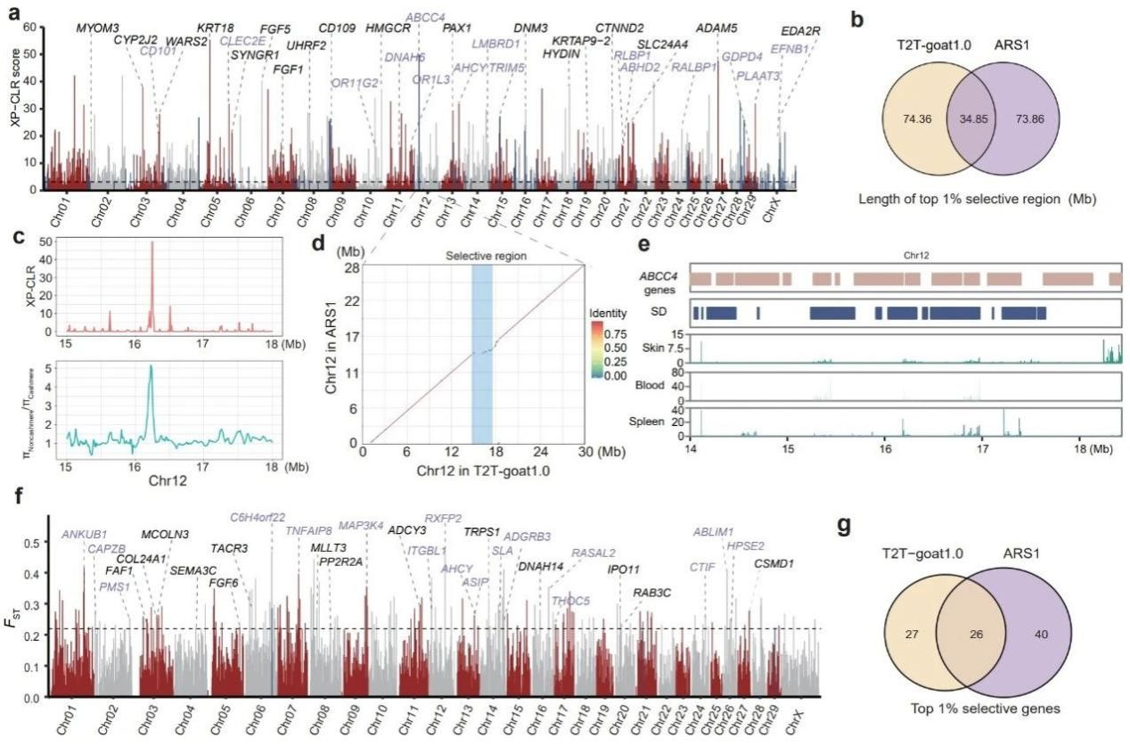 该研究还深入分析了羊绒性状的基因组选择特征,除了已被广泛研究的与羊绒产量和质量相关的基因(例如FGF5和EDA2R)之外,在PURs内发现了绒毛性状的274个选择信号,涉及72个基因。位于第12号染色体上的一个PURs区域(CHI12: 14.88 Mb–16.58 Mb)内,成功鉴定到了ABCC4基因的选择信号。进一步的比较分析发现原参考基因组ARS1中这一区域的组装并不完整;相比之下,在T2T-goat1.0中该区域包含了一个由14个串联重复的ABCC4基因。这一发现丰富了我们对羊绒性状遗传基础的认知,为未来通过基因组选择技术提升山羊的羊绒性能提供了新的靶点和思路。本研究极大地丰富了山羊研究的遗传信息库,为山羊在生物技术领域的多元化应用开辟了广阔的道路,为深入洞察绒山羊的遗传多样性特征、驯化演变历程以及性状选择机制提供了坚实的证据支持。