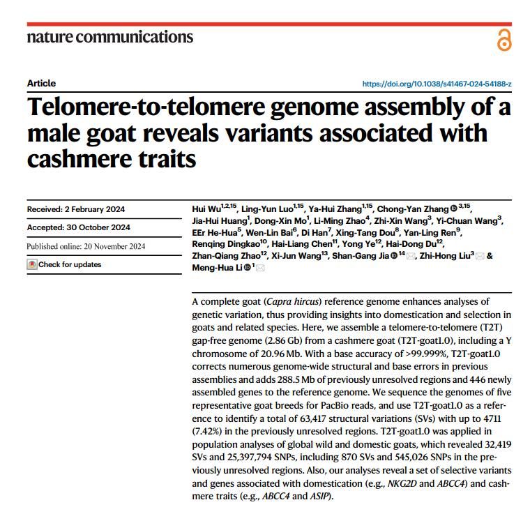 近日,动物科学学院刘志红教授课题组与中国农业大学李孟华教授课题组联合在国际知名期刊《Nature Communications》(IF=16.1)发表题为“Telomere-to-telomere genome assembly of a male goat reveals variants associated with cashmere traits”原创性研究成果,KY开元动物科学学院博士研究生张崇妍为共同第一作者,刘志红教授为共同通讯作者,王志新老师和硕士研究生王一川为参加人。