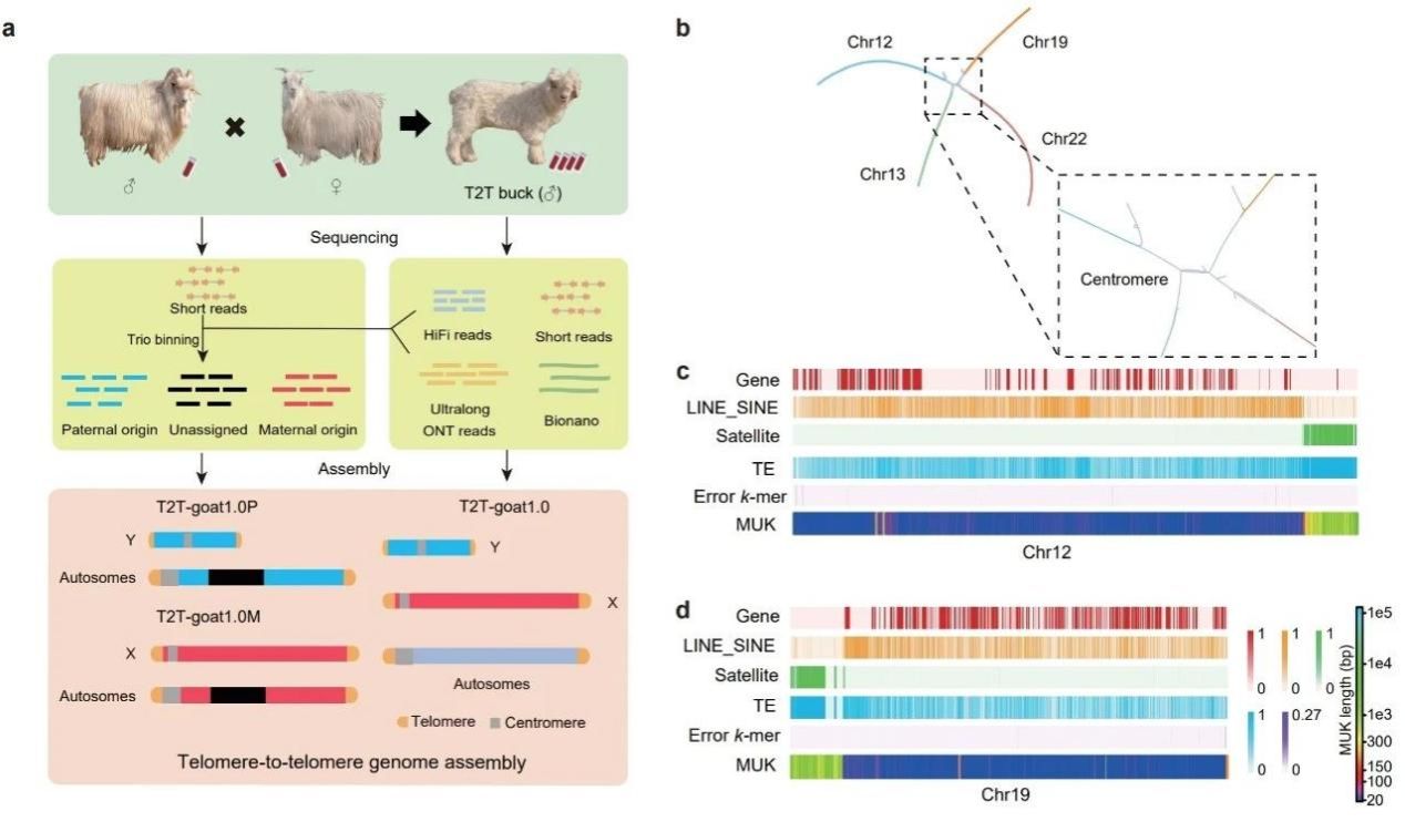 目前已经发表的山羊参考基因组中,许多关键区域的完整序列尚未被解析,尤其是Y染色体,导致对山羊基因组的整体结构、组织方式、进化历程以及各个区域的具体功能都缺乏深入了解。本研究以内蒙古绒山羊资源为材料,组装了山羊首个完整基因组(T2T-goat1.0),大小为2.86 Gb,包括着丝粒的独特特征、Y染色体的结构解析、结构变异(SV)等。
