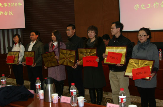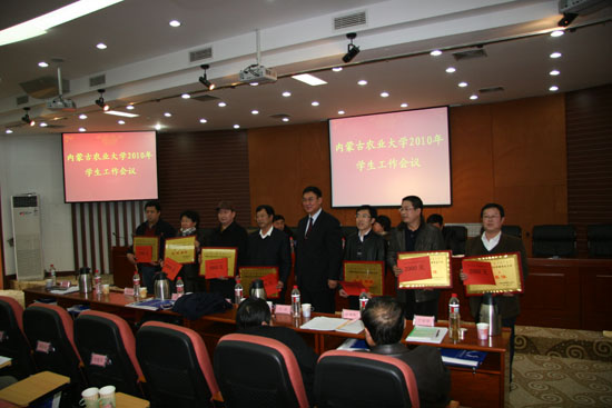 会议对2009年学生工作先进集体等进行了表彰,校党委副书记高晓英宣读了表彰决定。机电工程学院等7个学院获得“2009年学生工作先进集体”称号,原动物科学与医学学院团委等5个单位获得“2009年共青团工作实绩突出单位”称号,农学院团委等7个单位获得“2009年共青团工作创新奖”,材料科学与艺术设计学院等10个单位获得“2009年‘优良学风班级体创建’工作优秀组织单位”称号,外国语言学院等3个单位获得“2009-2010学年度第一学期‘星级文明宿舍’创建活动优秀组织单位”称号,外国语言学院等10个单位获得“2009-2010学年度第一学期‘星级文明宿舍’创建活动获奖金单位”称号。校党委书记云荣布扎木苏等领导同志为获奖单位颁奖。