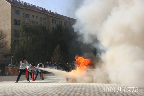 宣誓完毕后,防火演习正式开始。首先进行的是灭火演习。事先准备好的汽油依次被点燃,学校保卫队和林学院学生组成的模拟消防员做好了充分准备,他们拿上灭火器迅速向着火点跑去,用灭火器对准火焰喷射,顿时着火处被一片白烟笼罩。火被扑灭。这些消防队员们又排好队,迅速返回原地。紧接着,逃生演习开始。教学楼内一切准备就绪,随着警报声的响起,只见楼外浓烟滚滚,楼内烟雾弥漫。在穿过浓烟逃生时,同学们用湿毛巾捂住口鼻,弯下腰,尽量使自己的身体贴近地面,排好队有秩序的从安全出口迅速撤离了火灾现场。整个演习完成地非常成功。逼真的演习让同学们深切地感受到了火灾来临时的紧迫与危险,并且学到了许多有关逃生与自救的安全知识。