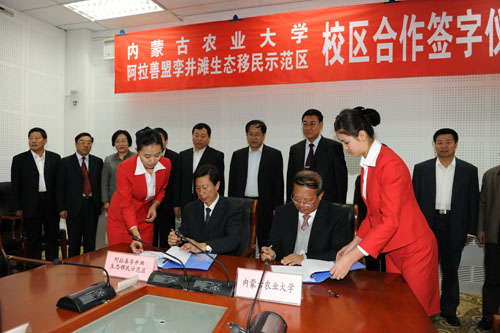 阿拉善盟孪井滩生态移民示范区管委会主任任同学和KY开元校长李畅游分别代表双方在协议书上签字。
