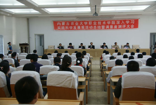 9月10日下午, 职业技术学院召开深入学习实践科学发展观活动总结暨满意度测评大会。校党委副书记郑俊宝,校统战部部长兼组织部副部长傲日布,校长助理、职业技术学院党委书记王效亮,院党委副书记吴兴梅,副院长冯贵宗、郭奇斌及全院副科以上干部、教研室主任、党支部委员、教代会代表、教师代表、民主党派代表、离退休教职工代表、学生代表出席大会。大会由职业技术学院党委副书记、院长葛茂悦主持。
