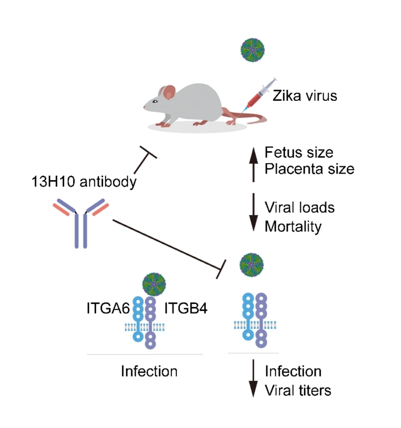 在本研究中,我们发现整合素β4(ITGB4)的胞外域是ZIKV的受体。ITGB4通过直接与ZIKV的E糖蛋白相互作用来介导病毒感染,而敲除ITGB4则阻碍了ZIKV与宿主细胞的结合和复制。针对ITGB4的功能性单克隆抗体能够有效降低ZIKV与易感细胞系的结合和感染。更为重要的是,ITGB4抗体可以阻断ZIKV对小鼠胎盘的感染,从而保护胎儿免受ZIKV的侵害。综上所述,我们的研究表明ZIKV的感染过程依赖于ITGB4介导的结合。