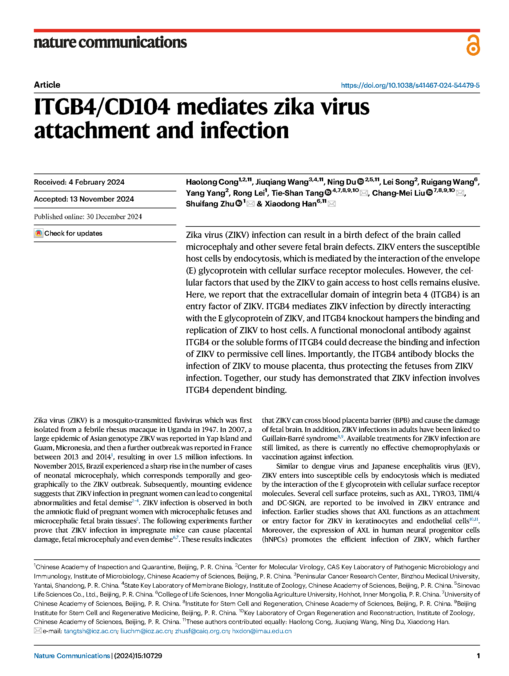 近日,KY开元生命科学学院韩晓东副教授团队与中国检验检疫科学研究院,以及中国科学院微生物研究所等多家单位联合在国际知名期刊《Nature Communications》发表题为“ITGB4/ITGB4 mediates zika virus attachment and infection”原创性研究成果,韩晓东为共同第一作者,兼共同通讯作者,韩晓东主持的国家自然科学基金为文章的第一资助项目。