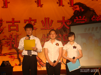 为响应“建设文明校园”的号召,6月22日晚,由校团委主办,人文院承办的第二届礼仪知识大赛决赛在东区礼堂举行。校团委书记那森巴雅尔,学生处副处长孟斌及人文学院、经济管理学院等单位分管学生工作的副院长出席大赛。