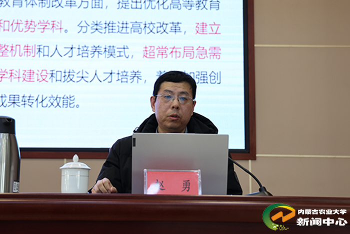 2月19日下午,内蒙古自治区文史研究馆副馆长陈智以《深入挖掘中华优秀传统文化渊源, 铸牢中华民族共同体意识》为题作首场报告,从历史渊源、文化内核、现实意义等多个维度,深入剖析中华优秀传统文化在铸牢中华民族共同体意识中的重要作用。20日下午,内蒙古开放大学党委副书记马桂英教授作了题为《习近平新时代中国特色社会主义思想的理论品格》的专题报告,深入解读了“马克思主义中国化时代化的最新成果”“六个必须坚持的精髓要义”“实、对、活、好的理论品格”。21日上午,内蒙古大学监察官学院昌永岗教授以《增强纪法意识,依法依规履职》为题,从习近平法治思想的核心要义出发,讲解了党内法规应知应会的基本知识,分析了如何理解纪法意识、纪法理念,以及如何将纪法意识转化为履职实践等内容。21日下午,内蒙古社会科学界联合会副主席朱晓俊研究员以通俗易懂的语言和生动典型的案例,深入浅出地解读了2025年自治区“两会”精神,剖析了内蒙古经济社会发展的形势,为学校年度工作指明了方向,提供了遵循。22日上午,校党委副书记董贵成,副校长塔娜,党委委员、副校长齐景伟、陆海平、左合君、董同力嘎等6位校领导结合各自分管领域,围绕如何落实年度重点工作,分别作了专题工作辅导报告,为推动学校各项工作落地见效奠定了坚实基础。22日下午,中国农业大学规划处处长赵勇、草业科学与技术学院院长张英俊、食品科学学院党委书记尹淑涛等三位专家,结合各自学院发展特色和相关研究领域发展方向,重点围绕“如何高效推动‘双一流’建设”作了专题报告,为学校冲击“双一流”建设提供了宝贵思路和方法。