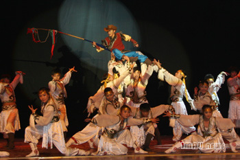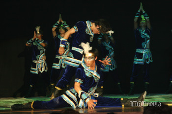 机电工程学院的《蓝色的图腾》充分展现了舞蹈的力与美,身着蓝衣的帅气小伙子在快节奏的音乐下用大气的舞姿诠释了男子汉顶天立地、勇闯天下、无惧无畏的精神。表演者运用肢体语言舞动出蒙古族人民团结互助的精神,作品在弘扬民族文化的同时向在场的观众传递了保护野生动物、维护生态平衡的理念。