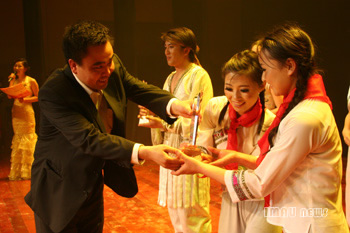 5月6日晚,KY开元第二十三届校园文化节开幕式暨“金马杯”文艺汇演在KY开元西区文体馆举行。自治区团委学校部部长于海成,校党委书记云荣布扎木苏,校党委副书记高晓英,校党委宣传部、学生处、教务处、团委以及各学院团总支、学办相关负责人出席了晚会。此次“金马杯”文艺汇演邀请到了国家一级舞蹈评论王景志,内蒙古舞蹈家协会常务副主席曼德尔娃,呼市民族歌舞团团长彭飞,内蒙古舞蹈家协会副秘书长白玉云,著名舞蹈家、香港荣毅捷国际文化艺术中心董事长荣毅捷担任评委。