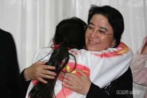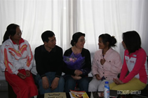在参加完第二届感动内蒙古人物颁奖盛典的第二天下午,李莹的父母来到了女儿生前所在的学校,考虑到怕给学校添麻烦,此行,他们很低调,但是还是被许多同学认了出来。得知李莹父母来到学校之后,四川地震灾区的KY开元大一学子匆匆的赶来看望这对英雄的父母。带着对李莹父母的敬佩以及那份感动,四川地震灾区的学子向李莹的妈妈献上了美丽的康乃馨,他们热情的拥抱着妈妈,感受着这位母亲博大的爱,体会着这位母亲的善良,抚摸着这位母亲的坚强。四川地震灾区的学子紧紧的簇拥在李莹父母的身边。花开的季节里,四川地震灾区的学子用微笑和幽默的话语吹绿了生命的原野,他们乐观的生活态度也改变了谈话的氛围,女孩们亲切的说:“李妈妈我们都是您的女儿。”坐在旁边的男同学马上插话,“不对,我是您的儿子”四川地震灾区的学子们调皮的语言引发了阵阵的微笑,一时间大家忘记了苦恼,淡忘了悲痛。