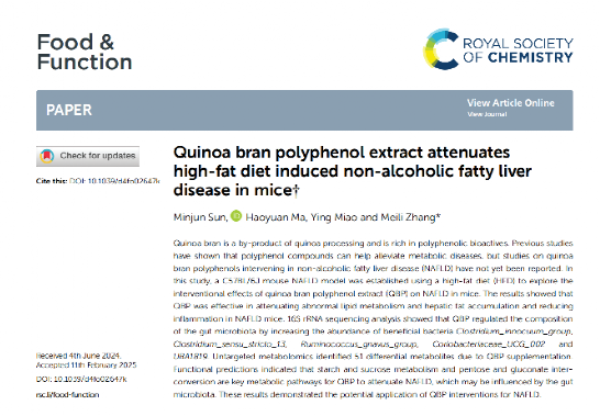 近日,食品科学与工程学院张美莉教授课题组在中国科学院分区的一区TOP期刊《Food & Function》发表题为“Quinoa bran polyphenol extract attenuates high-fat diet induced non-alcoholic fatty liver disease in mice”的研究成果,2022级博士研究生孙敏君为论文第一作者,张美莉教授为通讯作者。该项研究工作得到了国家重点研发计划(2023YFD1600704)的资助。