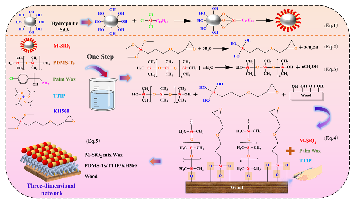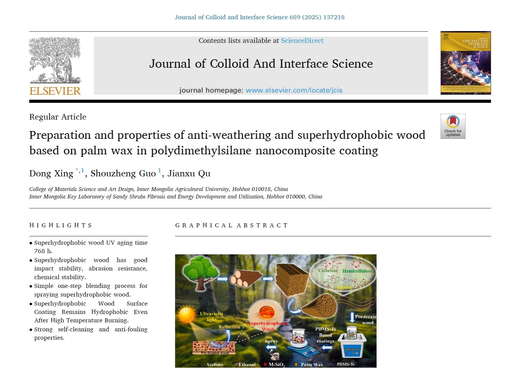 近日,材料科学与艺术设计学院邢东副教授课题组在期刊《Journal of Colloid And Interface Science》发表题为“Preparation and properties of anti-weathering and superhydrophobic wood based on palm wax in polydimethylsilane nanocomposite coating”的研究成果(中国科学院一区Top,IF=9.4,DOI:10.1016/j.jcis.2025.03.007),邢东副教授为论文第一作者兼通讯作者,2023级硕士研究生郭首政为论文的共同一作。该研究得到了国家自然科学基金青年项目(31700484)、内蒙古自治区沙生灌木资源纤维化和能源化开发利用重点实验室能力建设项目(BR251021)、内蒙古自然科学基金面上项目(2021MS03092)的资助。