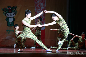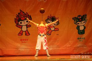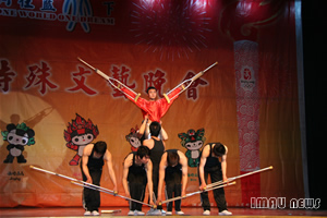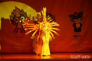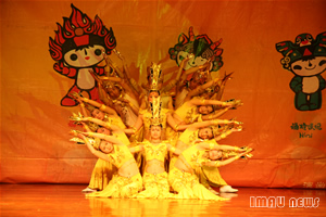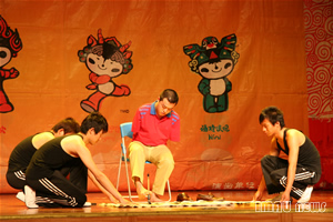 以福娃和奥运火炬为背景的舞台设计彰显了残疾人追求理想、热爱生活、不屈不挠的生活观和价值观。本次晚会的特殊之处在于他的表演团体和表演风格。所有演员都是来自“雄鹰”残疾人艺术团的残疾人演员,他们利用拐杖、火柴等特殊的道具以独特的表演形式将舞蹈、杂技、朗诵、歌曲搬上了舞台。在手语老师的指挥下,手舞红绸的聋哑演员表演的舞蹈《好运来》拉开了晚会的大幕。轮椅之上朗诵者任爱华用坚强和信心向世界展示了一颗勇敢的心,并代表全国8300多万残疾人向所有关心残疾人事业的好心人致谢。首届全国残疾人文艺汇演一等奖获得者陈少奇以火柴为乐器演奏了《北京欢迎你》,向世界发出了一个盲人最真诚的邀请。舞蹈《飞翔》中一名失去左腿的舞者与其他舞蹈演员一起,利用拐杖这个独特的道具搭起了一双飞翔的翅膀。失去双手的“雄鹰”残疾人艺术团团长牛栋,用一双美丽的大脚撑起了残疾人自强不屈的信念,他用脚在纸上写下了“拼搏进取”四个大字并将其赠予KY开元,校党委宣传部副部长米继伟代表学校接受了这份特殊礼物,他说:“通过这场晚会我们看到了残疾人战胜困难的信心和勇气,希望广大学子学习他们坚韧不拔的毅力和品质,努力学习,为共建和谐社会而努力”。杂技表演上神奇的换帽表演和精彩的棒上传球博得了观众们的热烈掌声,小丑的滑稽加上表演者的高超技艺让表演变得更加生动有趣。小号独奏《西班牙斗牛曲》无疑成为本次晚会的一大亮点表演者诙谐幽默的语言和乐观的态度征服了在场的每一位观众。“所有残疾人将用泪水和汗水向所有人证明今天站在你们面前的残疾人永远不是残废人”这位盲人演员满怀深情的话语感动了在场的所有观众,台下掌声经久不衰,人们为这位盲人鼓掌,向天下所有的残疾人致敬。舞蹈《千手观音》以其独特的舞资和美轮美奂的舞台设计为观众带来了一场视听盛宴,这群来自无声世界的舞者创造出了一种特殊的美丽,给观众带来纯净至美的艺术享受,同时也为晚会画上了圆满的句号。