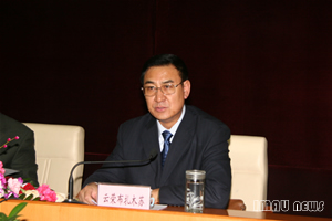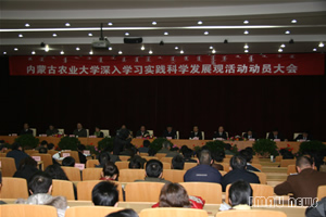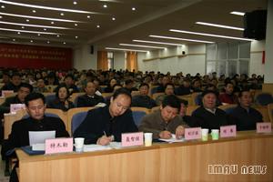 3月26日下午,校党委在新教学楼报告厅召开深入学习实践科学发展观活动动员大会。自治区党委第六指导检查组组长杨舜才、成员特木勒、聂志煊、刘沙滨应邀出席大会。校党政领导云荣布扎木苏、李畅游、郑俊宝、高晓英、陈智、包赛音、王林和、侯先志、任强、李金泉、侯晨曦出席大会,全校副处级以上干部,党支部书记,校老领导代表,在KY开元工作的自治区人大代表、政协委员,民主党派代表,离退休人员代表和教师学生代表共四百余人参加大会。自治区主要新闻媒体记者也参加了大会并进行了采访报道。自治区党委第六指导检查组组长杨舜才同志作重要讲话,校党委书记云荣布扎木苏同志代表校党委作动员报告。大会由校党委副书记、校长李畅游同志主持。