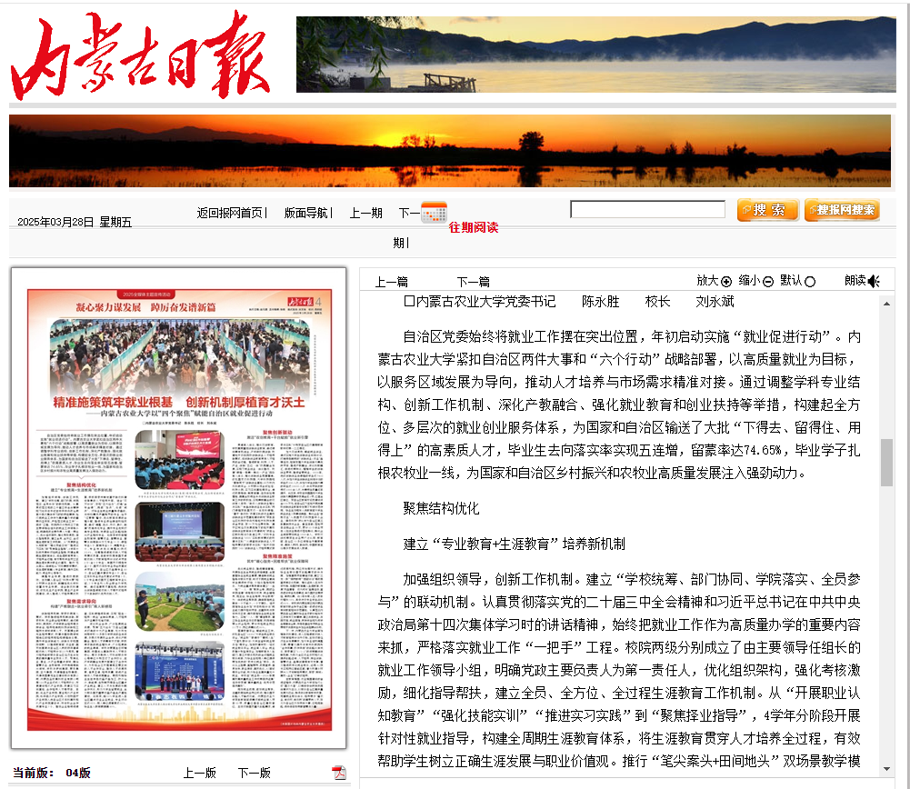 【编者按】内蒙古日报刊3月28日第4版整版刊发了学校《精准施策筑牢就业根基 创新机制厚植育才沃土》一文,文章系统总结了学校以“四个聚焦”赋能自治区就业促进行动的创新实践,展示了专业布局“做加减”、产教融合“链贯通”、双创教育“育沃土”、就业服务“织密网”的生动图景。文章彰显了学校以立德树人为根本,以服务“国之大者”为使命,扎根北疆、强农兴蒙的担当,有利于进一步扩大办学影响力,助力学校“双一流”建设。