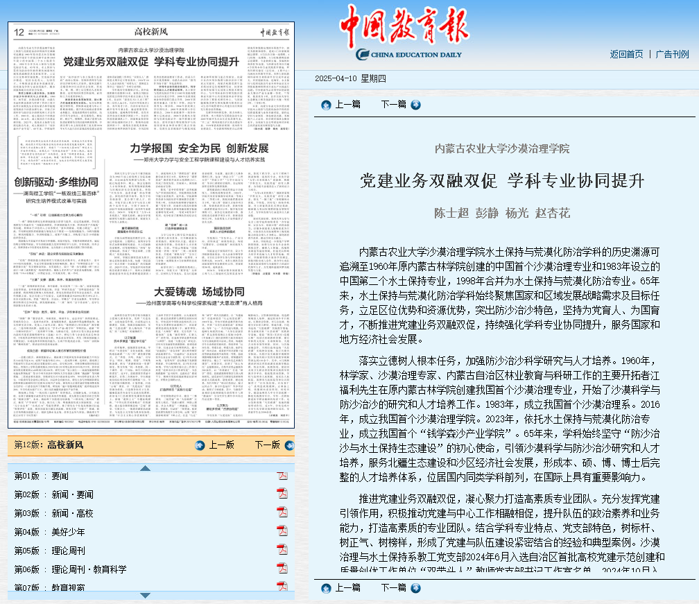 【编者按】《中国教育报》2025年04月10日第12版刊发文章《党建业务双融双促 学科专业协同提升》,介绍了自1960年创建中国首个沙漠治理专业以来,水土保持与荒漠化防治学科始终立足国家战略需求,深耕北疆生态屏障建设。历经65年发展,该学科构建了本硕博全链条人才培养体系,形成“党建+业务”双融双促的特色路径,打造了以省部级团队为核心的科研创新和教学力量,建成省部级重点实验室等一批高端平台,科研反哺教学,助力人才培养和学生创新。