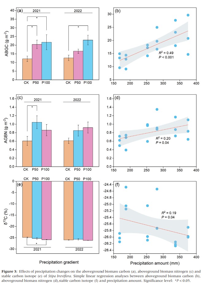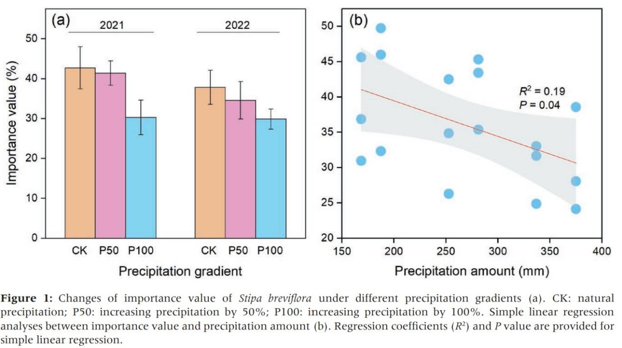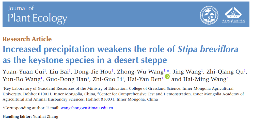 近日,草业学院草地生态团队王忠武教授课题组在环境科学与生态学领域一区Top期刊《Journal of Plant Ecology》发表题为“Increased precipitation weakens the role of Stipa brevifora as the keystone species in a desert steppe”的研究成果。该论文揭示了降雨变化对荒漠草原优势植物短花针茅重要值变化的“双刃剑”效应,为深入研究荒漠草原植物群落对气候变化的响应机制提供了理论依据,对干旱区植被恢复策略制定具有重要参考价值。