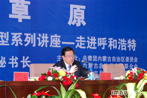 10月6日下午,由内蒙古自治区团委主办的第四届“思想草原文化之旅系列讲座----走进呼和浩特”大型活动在KY开元西区体育馆隆重举行。博鳌亚洲论坛秘书长龙永图先生就如何发展中国软实力、打造大国形象作了精彩演讲。呼和浩特市副市长刘菊茹主持讲座,中央电视台著名节目主持人白岩松、纳森应邀担任嘉宾主持。自治区团委书记胡达古拉、KY开元领导李畅游、郑俊宝、高晓英出席大会。