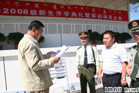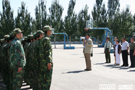 云荣布扎木苏书记发表讲话 云荣布扎木苏书记翻阅学院军训报刊 云荣布扎木苏书记询问训练情况 云荣布扎木苏书记与新生交谈