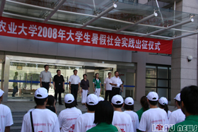 校党委副书记高晓英在出征仪式上讲话,对参加暑期社会实践的队员寄予了殷切希望,她希望通过此次社会实践活动能够增加同学们的社会阅历,提高自身综合素质;培养吃苦耐劳优秀品质,树立良好精神风貌,感受改革开放30年社会主义新农村成就;充分发扬KY开元优良传统,运用所学的专业知识,为构建社会主义新农村服务。接着,实践队员代表张春艳发言,她呼吁队员们要充分利用所学知识为广大农民群众服务,团结协作,和衷共济,不辜负学校、老师的希望,认真完成本次社会实践任务。