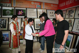 校党委副书记高晓英参观书画展 评委认真评选 校党委副书记高晓英为获奖者颁奖 霍如涛教授现场献艺