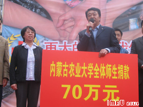 在此次活动中,高晓英副书记代表学校讲话,并将截止到今天为止、KY开元师生为灾区人民捐助的70万元人民币移交给了自治区红十字会。