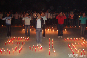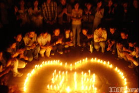 活动现场点燃了拼成心形图案的蜡烛,颤动着的火光内“5·12”的字样显得格外引人注目,在场的同学手手相牵,齐声高呼“众志成城、抗震救灾、自强不息、振我中华”,用《祝福》、《祝你平安》、《同一首歌》等歌声表达了对灾区人民的牵挂和祝福。
