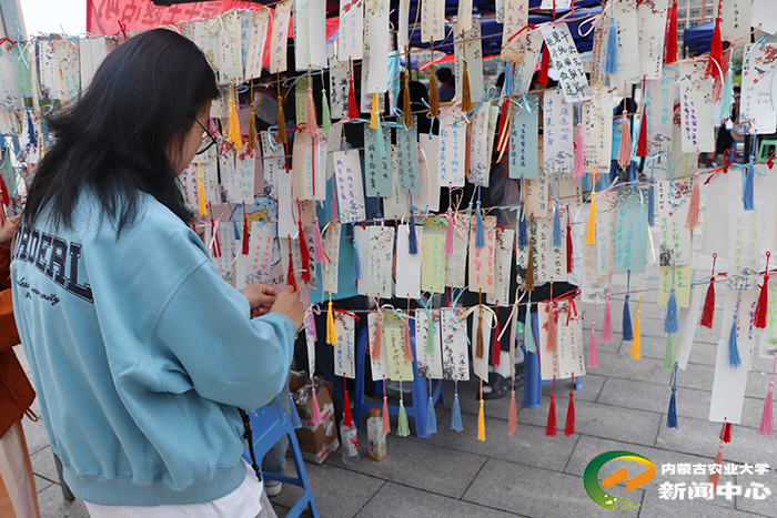 活动现场化身为穿越时空的文化长廊,千年民俗与青春活力碰撞出绚丽火花。“纸短情长·签语流光”区,同学们执笔写下端午寄语,彩绳缀签随风轻扬,诉说着青年学子千年未改的家国情怀。“拾趣·香囊DIY”区,艾草、菖蒲与薄荷的芬芳交织,同学们穿针引线制作的香囊承载着古今同频的安康祈愿。“趣玩·射五毒”挑战区传来欢笑阵阵,沙包掷向趣味靶心,让传统习俗焕发出新活力。“溯文脉·解字谜”区人头攒动,同学们热烈讨论着以表情符号设计的创意谜题,文化密码在趣味互动中悄然传承。而“揽月·国潮”打卡区更是人气爆棚,传统书法与时尚元素相映成趣,交织着流动的文化画卷,成为最受欢迎的拍照打卡点。