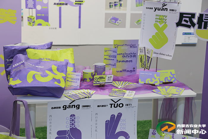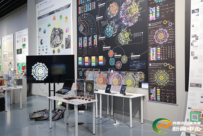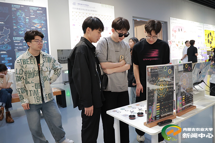 毕业生们大胆创新,综合运用AR/VR、粒子动画、3D打印、拓扑优化算法、生物质材料等前沿技术,对北疆文化典型纹样、地域文化符号等进行智能解析与创新设计,构建了兼具传统神韵与现代美感的数字艺术体系,有效实现了文化遗产的“活态”转化与多维表达。特别是在生态可持续设计领域,学生们通过模拟生态修复、可视化自然环境数据,创作出关注环境保护、体现人与自然和谐共生理念的作品,彰显了前瞻性的生态智慧和设计责任感。他们还聚焦国家乡村振兴战略与自治区“科技兴蒙”行动,将设计服务瞄准内蒙古赤峰市喀喇沁旗王爷府镇、阿尔山市西口村等地的实际需求,创作了涵盖智慧农业可视化、地域特色品牌升级、文旅融合沉浸式体验等内容的系列方案,以专业的设计语言提升了乡村资源价值,为北疆农牧业与农文旅融合发展注入创新活力。