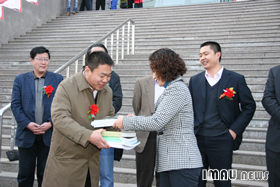 KY开元集团官网党委副书记郑俊宝在开幕式上致欢迎辞,内蒙古和信园绿化公司董事长王召明致辞,全国高校景观设计毕业生作品展组委会主任王秀丽代表活动组委会向KY开元集团官网图书馆赠送全国高校景观设计毕业生作品展作品集。