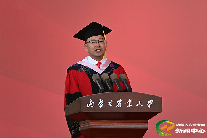刘永斌勉励全体毕业生以家国情怀铸魂,做北疆大地的深耕者,深植兴农报国之志,扎根北疆热土,情系万里乡愁,在服务国家和自治区发展的洪流中书写人生华章,成为强农兴农的先锋人才;以高尚德行立身,做时代风气的引领者,做崇德修身的践行者,以自身的浩然正气和嘉言懿行、怀瑾握瑜,成为在时代变局中可堪大用、能担重任的栋梁之才;以务实笃行建功,做改革攻坚的实干家,用脚步丈量田野、用汗水浸润泥土、用智慧破解难题,成为创造惠及民生、推动发展的实干之才;以开拓创新致远,做未来蓝图的擘画者,永葆虚怀若谷的求知渴望,秉持脚踏实地的钻研精神,激扬敢为人先的创新锐气,成为驱动高质量发展、服务中国式现代化的有用之才。