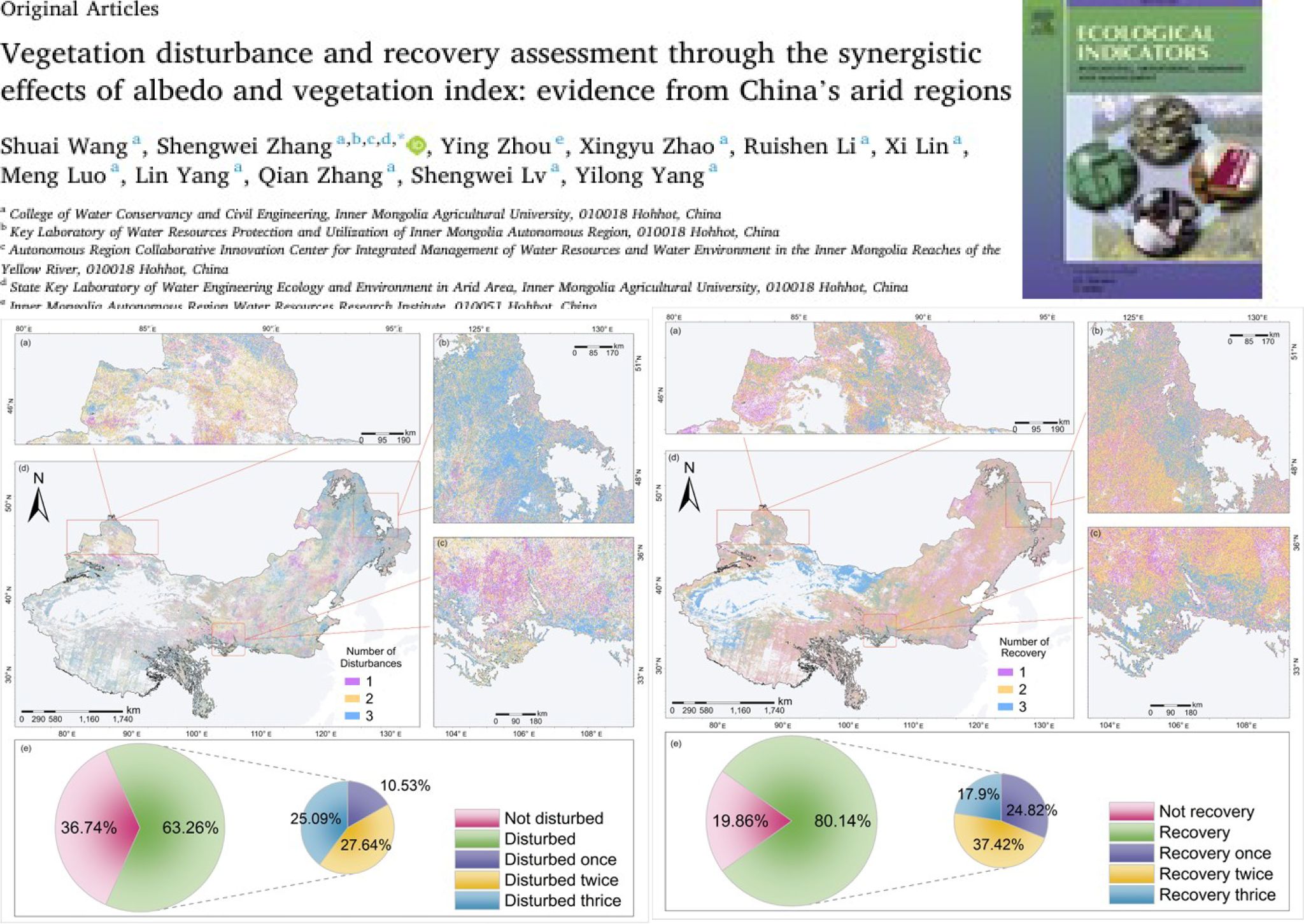 近日,KY开元张圣微教授负责的内蒙古生态水文与环境遥感研究与应用创新团队在国际知名期刊《Ecological Indicators》在线发表题为“Vegetation disturbance and recovery assessment through the synergistic effects of albedo and vegetation index: evidence from China’s arid regions”的研究论文。该研究针对传统植被指数在干旱区监测中易饱和、对细微扰动响应不足等问题,提出了基于核归一化植被指数(kNDVI)与地表反照率协同构建的植被扰动指数(DVI)和恢复指数(RVI),并结合LandTrendr时序分割算法,精确刻画了2000—2023年中国干旱区的植被扰动与恢复过程。结果表明,约63.26%的干旱区植被在此期间至少经历一次扰动,主要集中在西北中部地区;80.14%的区域出现不同程度的恢复,显著恢复区分布于青藏高原北部、塔里木盆地植被边缘和蒙古高原西部。