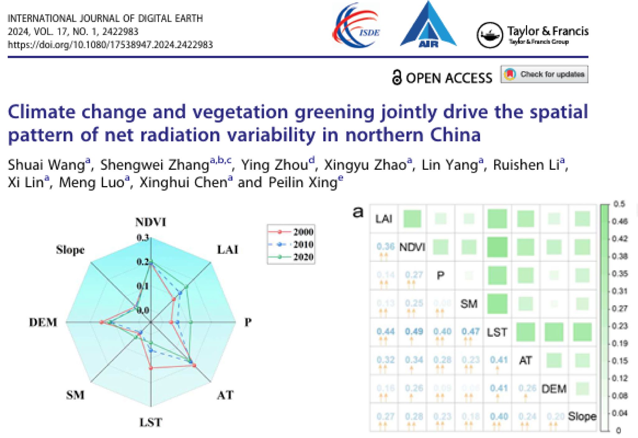 此外,该团队前期还在《International Journal of Digital Earth》发表题为“Climate change and vegetation greening jointly drive the spatial pattern of net radiation variability in northern China”的论文,从能量平衡视角揭示了气候变化与植被变绿对北方干旱区地表净辐射时空格局的共同驱动作用。研究基于遥感与ERA5数据计算得到高精度(R²=0.96)的净辐射数据集,利用趋势分析、空间自相关、GeoDetector和PLS-SEM等方法发现,气温和植被是主导净辐射变化的关键因子,且二者存在显著非线性增强效应。
