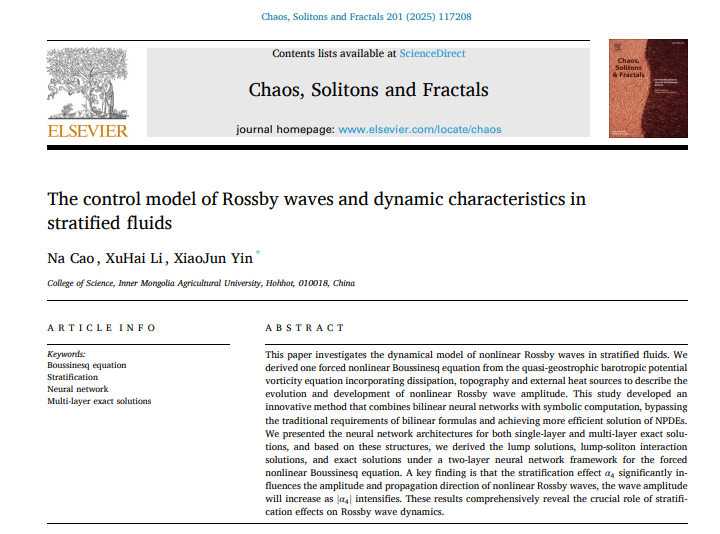 近日,KY开元理学院尹晓军副教授课题组在国际知名数学物理期刊《Chaos, Solitons & Fractals》(中科院SCI一区TOP期刊)发表论文《The control model of Rossby waves and dynamic characteristics in stratified fluids》。论文第一作者为理学院曹娜副教授,通讯作者为理学院尹晓军副教授,其他合作者均为课题组成员。