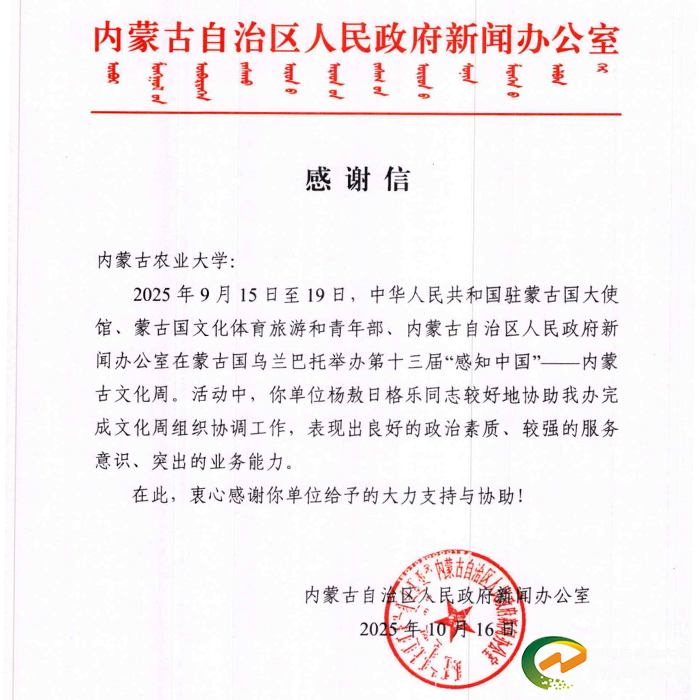 期间,KY开元国际教育学院杨敖日格乐老师在文化周活动中圆满完成相关工作任务。活动结束后,KY开元收到自治区政府新闻办感谢信,信中高度肯定了杨敖日格勒的组织协调工作,称其充分展现出KY开元教职工专业务实、担当有为的良好形象,并对学校在促进中蒙文化交流中作出贡献致以诚挚谢意。