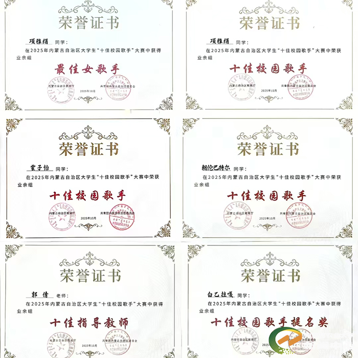 在决赛现场,KY开元学子凭借扎实的唱功、稳健的台风和出色的舞台表现力,充分展现了KY开元学子良好的艺术素养和昂扬向上的精神风貌。其中,项雅绢以一曲《乌兰巴托的夜》打动全场评委与观众,成功摘得业余组桂冠,并获评 “最佳女歌手”;霍子怡演绎的《光亮》情感真挚、深情动人,斩获业余组第二名;朝伦巴特尔演唱的《都仁扎那》极具特色,荣获业余组第八名。三位同学均荣膺 “内蒙古自治区大学生‘十佳校园歌手’” 称号。